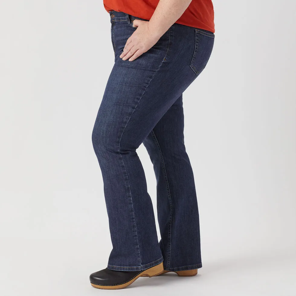 - Mid rise; trim hip and thigh, flared at leg opening to fit over boots